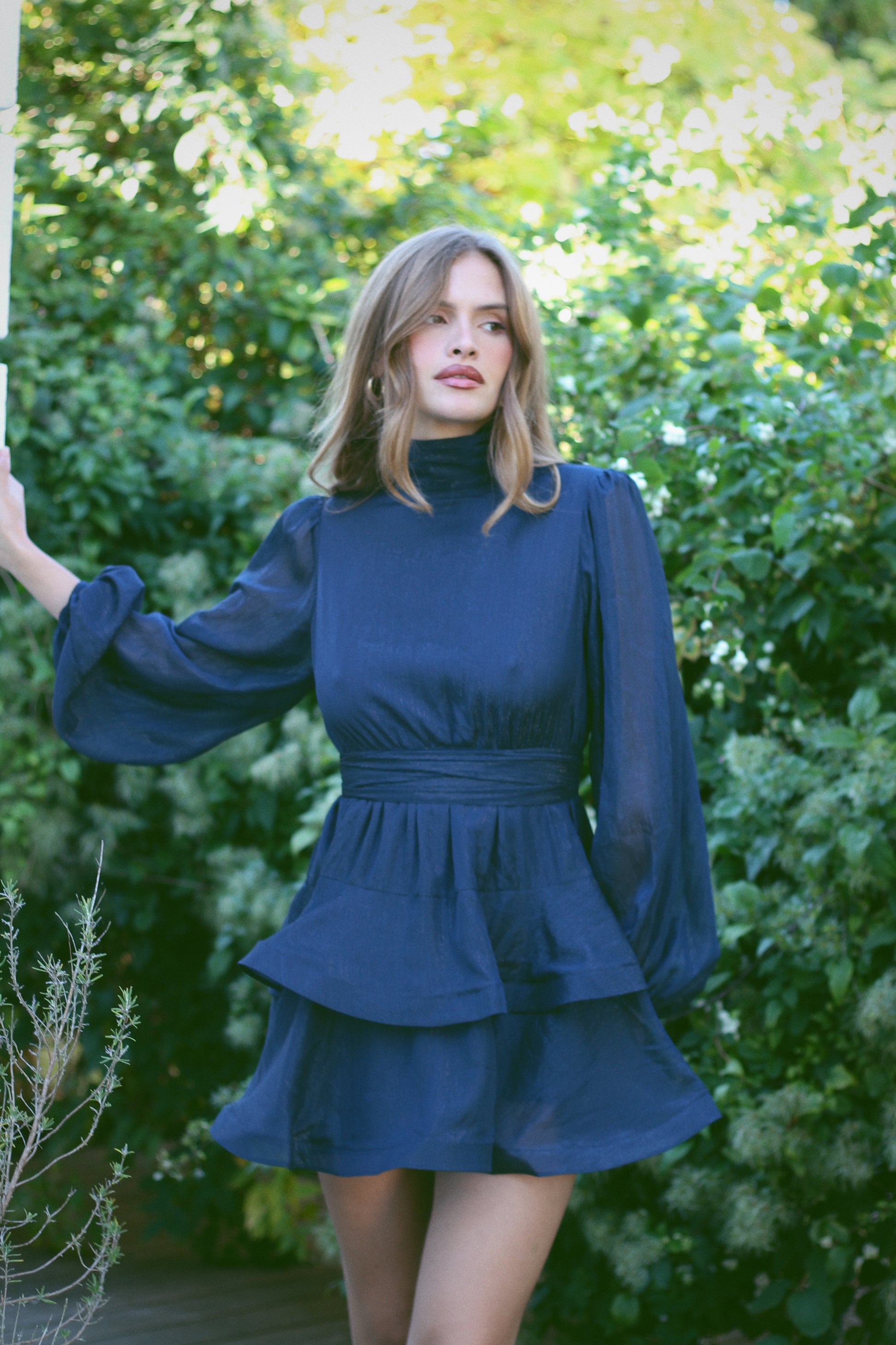 Med en sofistikert høy hals og et lekent volangskjørt er denne kjolen perfekt til julebord, nyttårsfeiring og andre spesielle anledninger.