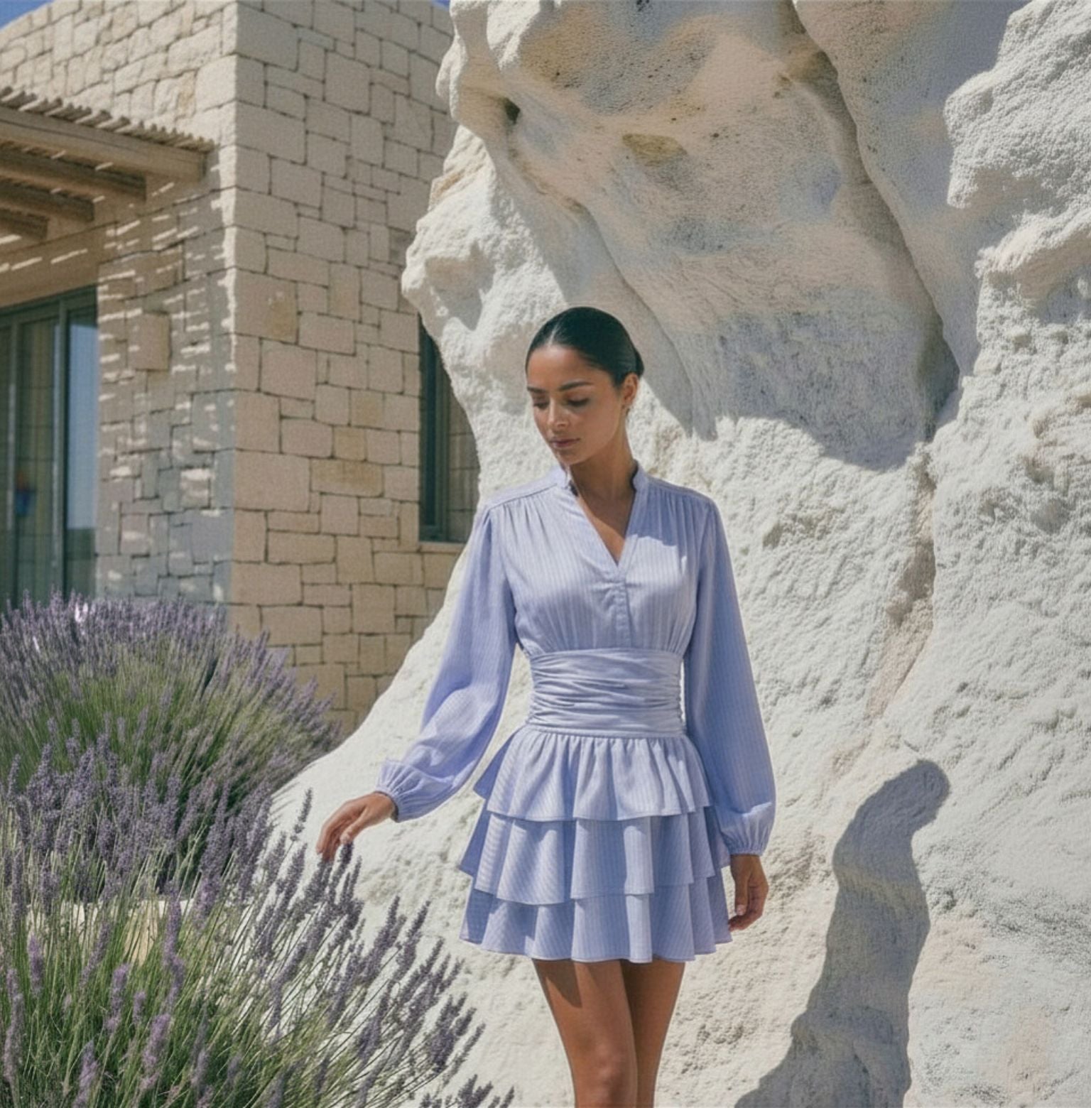 Nadine belted dress fra Kayani. En kjole som dette, som kan brukes til alt samtidig som den er så behagelig å ha på! Nadine dress er et nøkkelprodukt i ditt klesskap. Kjolen har v-utringning, lange armer og ruffle skjørt.