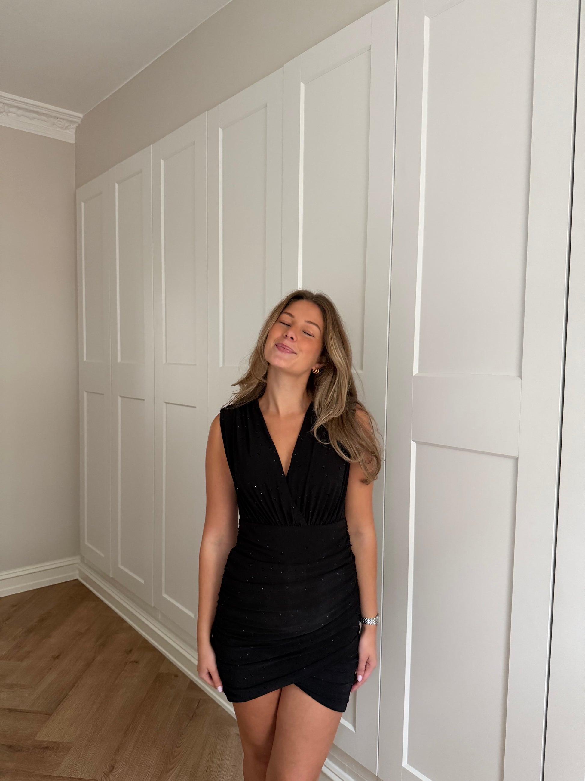 Key Features: - Stylish V-neck design - Sparkling black details for a luxurious look - Back zipper for easy wear - True to size for a perfect fit - Ideal for autumn parties and Christmas celebrations